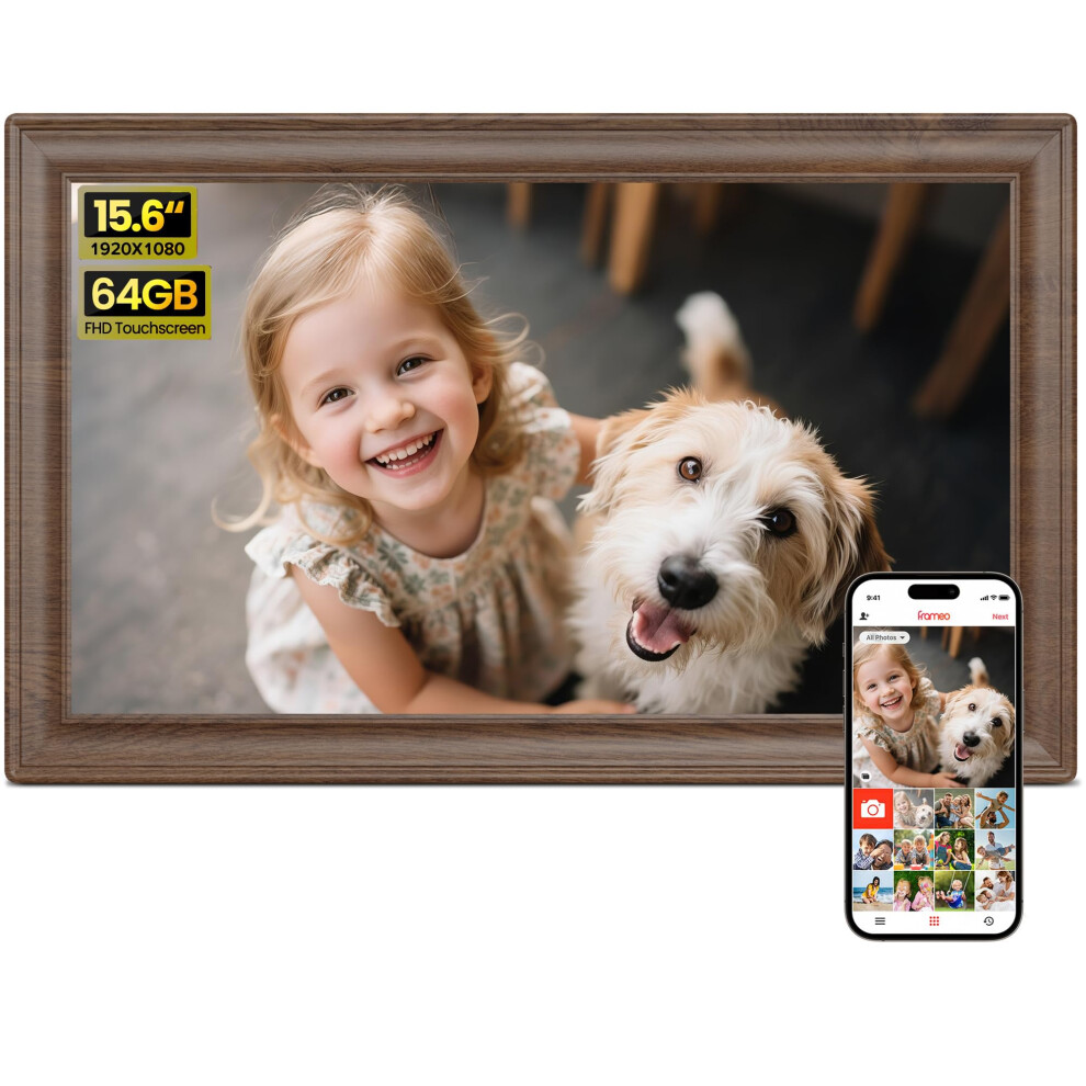 Frameo WiFi Digital Photo Frame 15.6 Inch Wooden - 1920 * 1080P FHD IPS Touch Screen Picture Frame Electronic, 64GB Memory, Auto Rotate, Wall Mountable, Sharing Photos and Videos