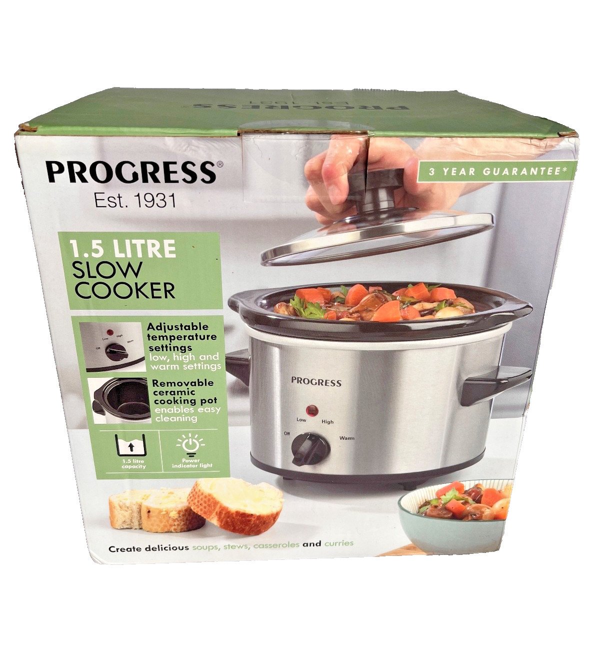 Stainless Steel Cooker Progress 1.5 L Slow Ceramic Pot Low/High/Warm Glass Lid