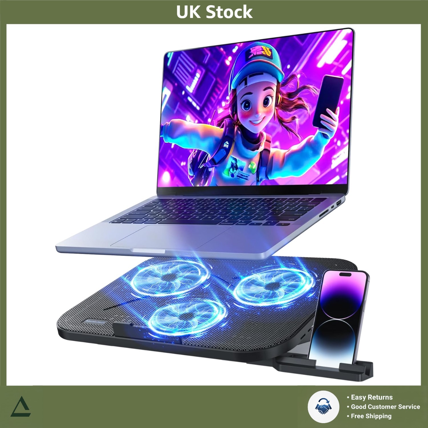 Laptop Cooling Pad with 3 Quiet Fans, 5-Level Height Adjustable Ergonomic Stand, 2 USB Ports & Phone Holder, Fits 12-17 Inch Laptops, Family-Friendly for Gaming/Work/Online Class