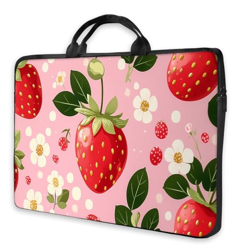 HSDEXWRI 17 Inch Tablet Sleeve, Pink Strawberry Pattern Case, Cute Fruit Art Bag with Zip Pocket, Shockproof Canvas Protective Cover for Girls & Women