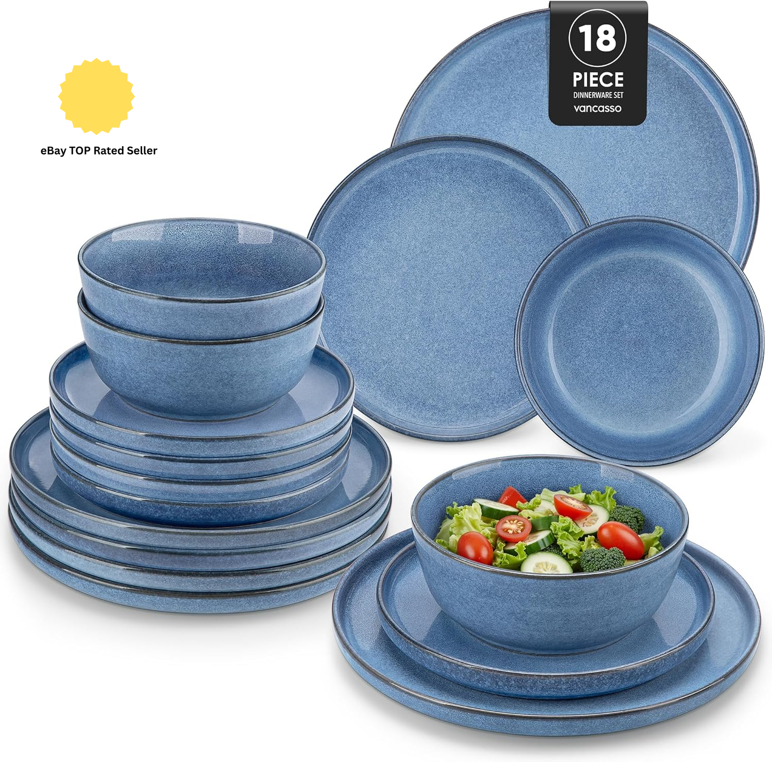 vancasso ANYA Plates and Bowls Set, 18 Piece Dinner Plates Set of 6, Include Ceramic Dinner Plates, Dessert Plates, and Cereal Bowls, Dishwasher and Microwave Safe, Blue
