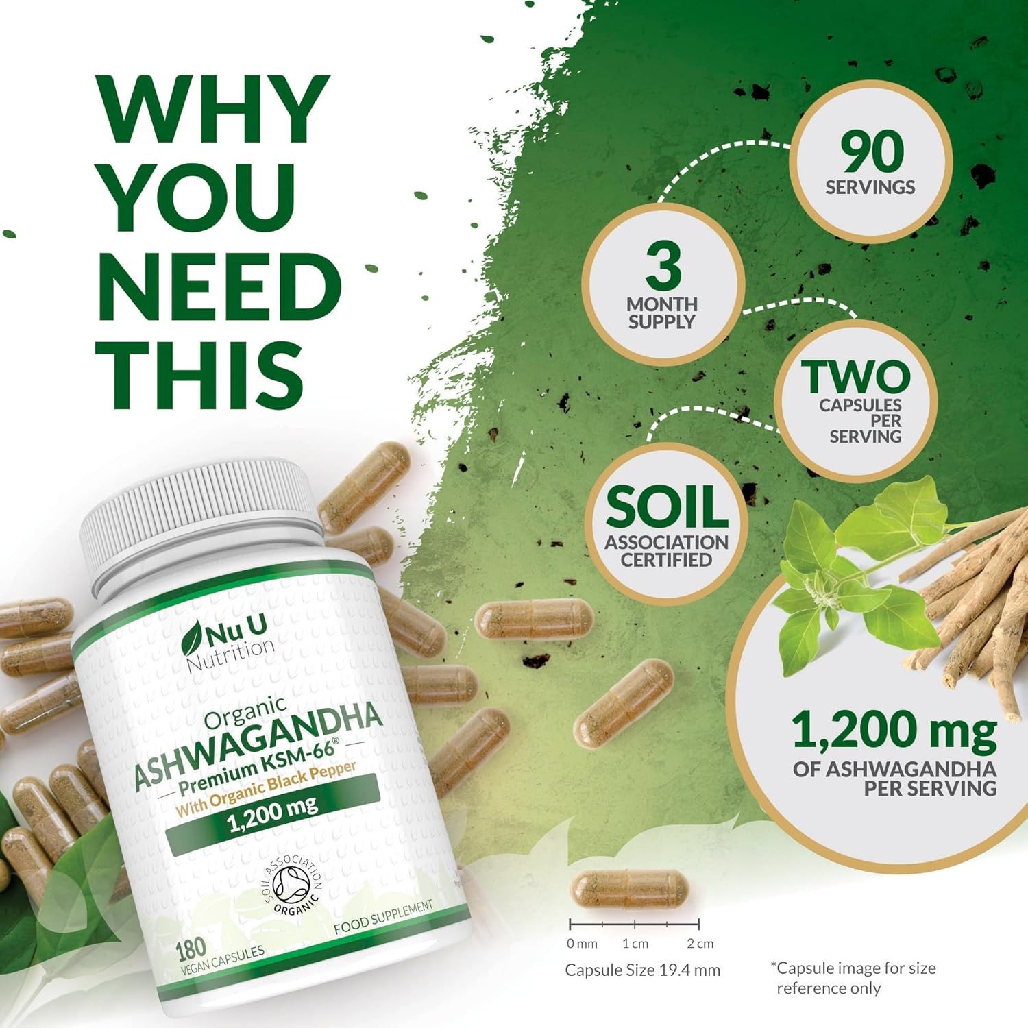 Organic Ashwagandha KSM-66® 1200Mg - 5% Withanolides - 180 Vegan Capsules Not Ta