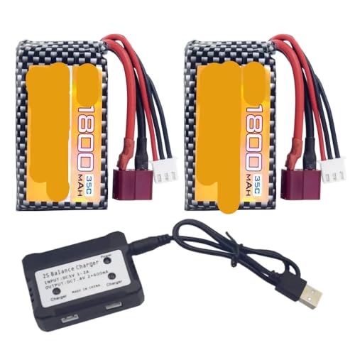 7.4V 35C 1800mAh LiPo And 2 In 1 Charger Compatible With K929-B A959-B 12402 12403 12404 12423 12428 144001 1/18 1/14 Scale RC Cars(2pcs and charger)