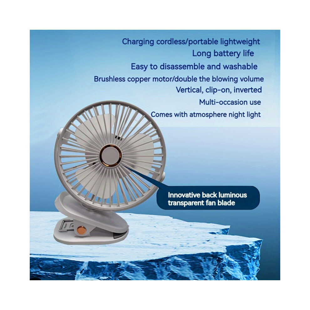 (White) Portable Clip-On Table Fan, 360 Rotatable, 5-Speed Adjustable, Strong Grip, Rechargeable 18650 Lithium Battery,