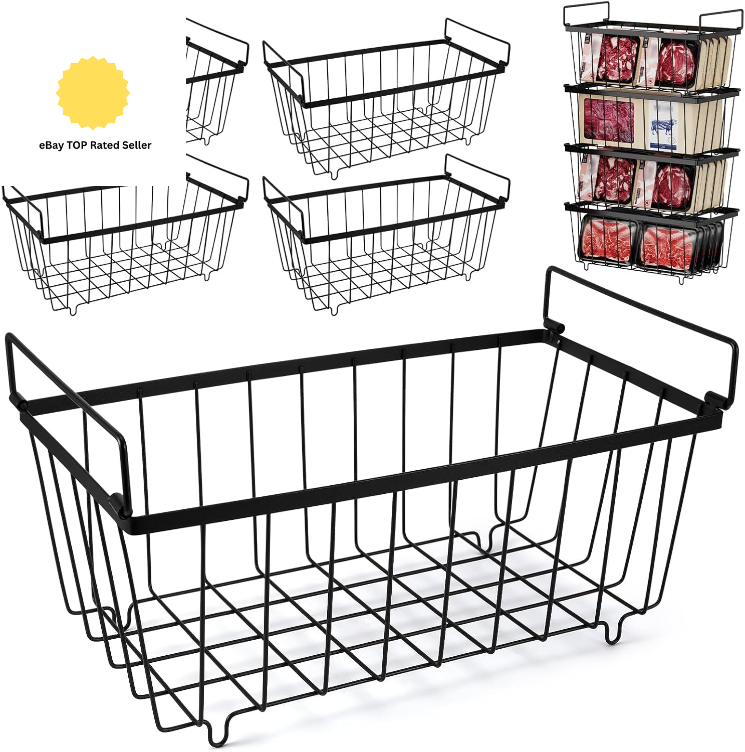 Stackable Chest Freezer Baskets - 4 Pack for 198L Freezer Organization, Black