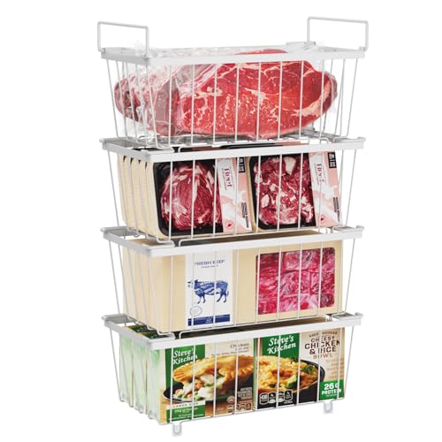 iSPECLE Chest Freezer Baskets - 4 Pack Stackable Wire Basket Add Space for 198L Deep Freezer Easy Get Food with Handles, Sort Food Air Circulation Keep Better Freshness, White