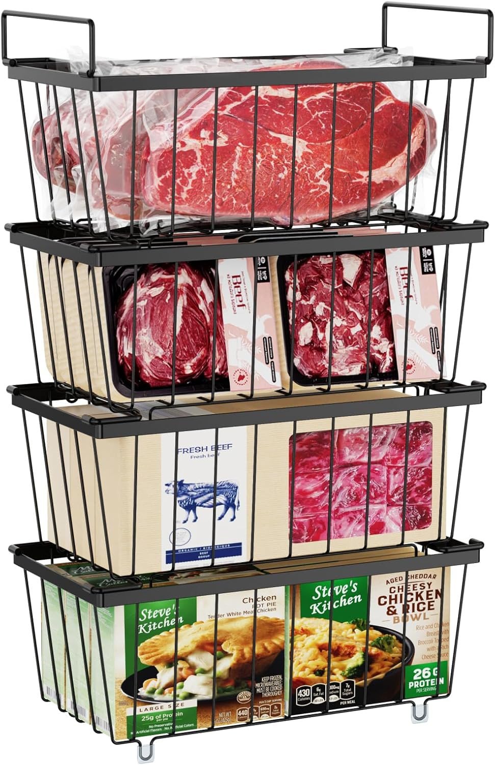 iSPECLE Chest Freezer Baskets - 4 Pack Stackable Wire Basket Add Space for 198L Deep Freezer Easy Get Food with Handles, Chest Freezer Baskets Sort Food Air Circulation Keep Better Freshness, Black