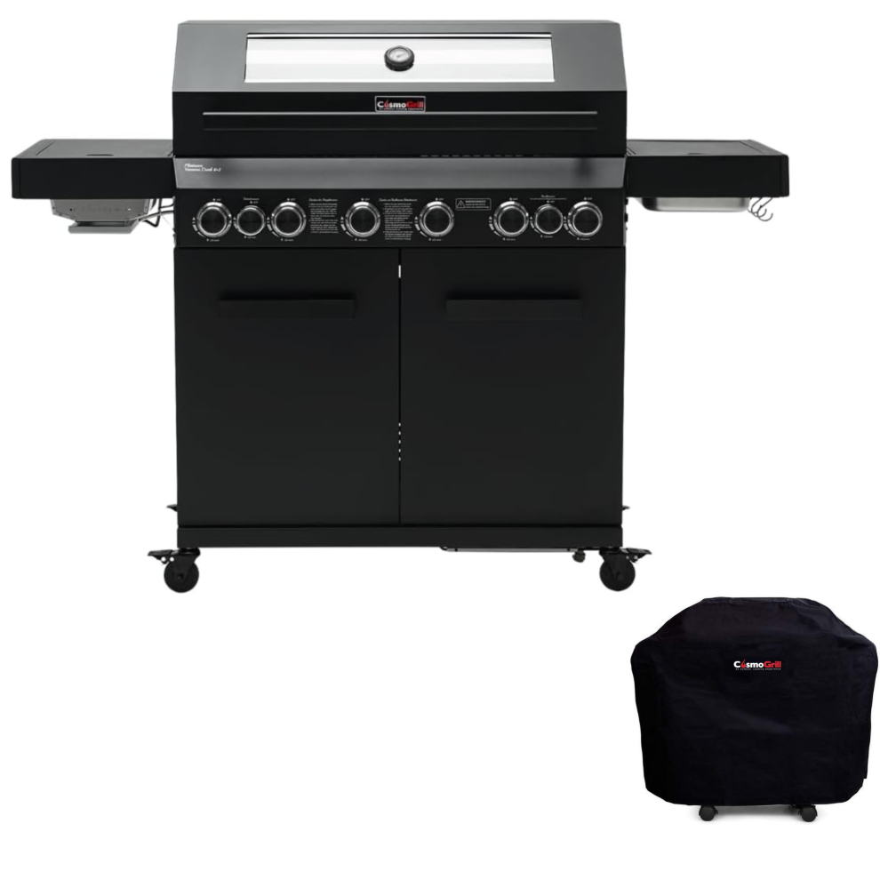 CosmoGrill 8 Burner Platinum Yamara Dark 6+2 Gas BBQ, Viewing Glass, 4 Main Burners, 1 Ceramic Sear Burner, 1 Back Burner, Cast Iron Grills & Bamboo Storage (Black with Cover)