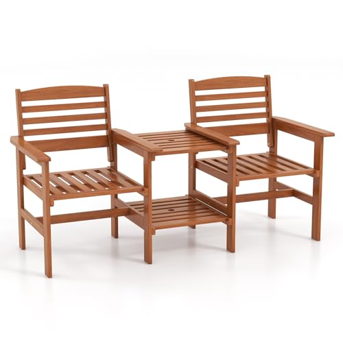COSTWAY 2-Seater Garden Loveseat, Wooden Bench Seat with 2 Tier Coffee Table and Umbrella Hole, Outdoor Twin Patio Chairs Conversation Furniture Set (Brown, 165 x 60 x 88cm, without Cushions)