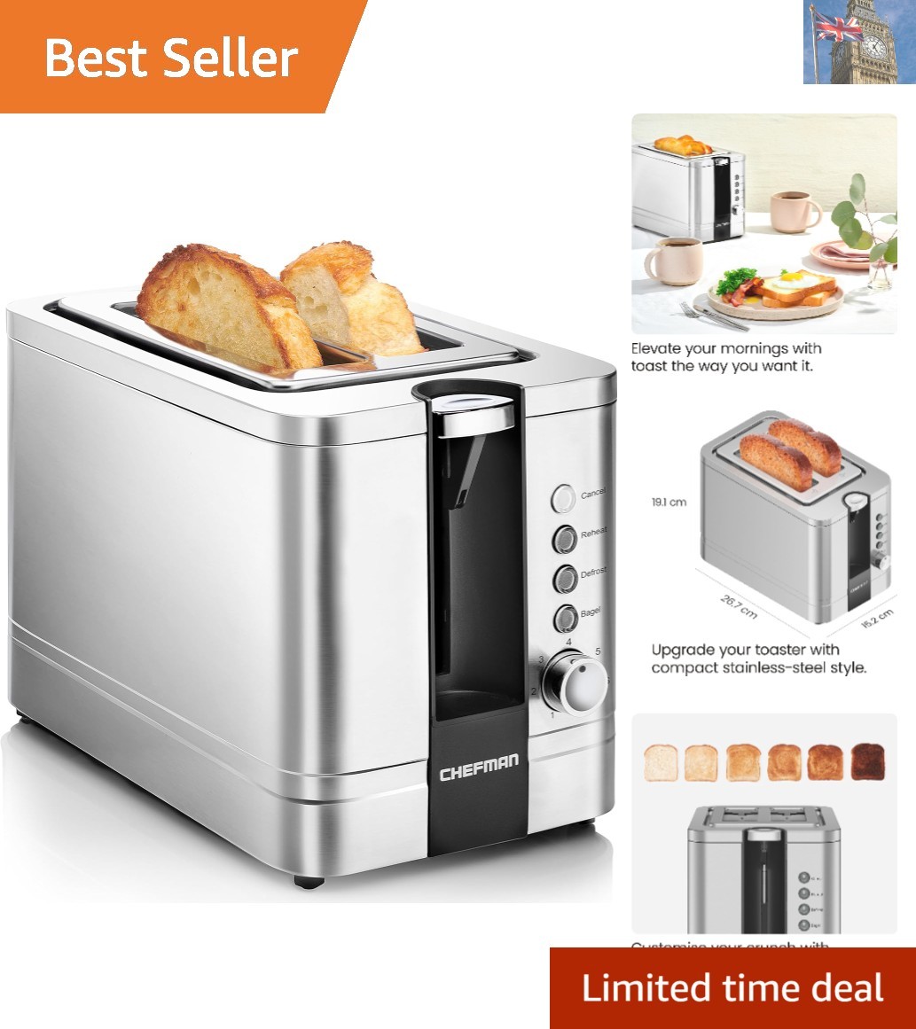 Chefman 2 Slice Toaster, 7 Shade Settings, Stainless Steel, 2 Slice with Extra-Wide Slots, Thick Bread and Bagel Toaster, Reheat, Defrost, Cancel, Lift Lever, Removable Crumb Tray