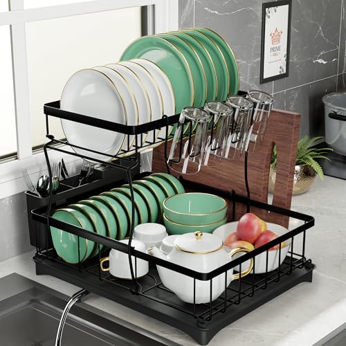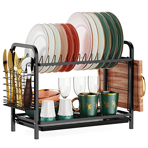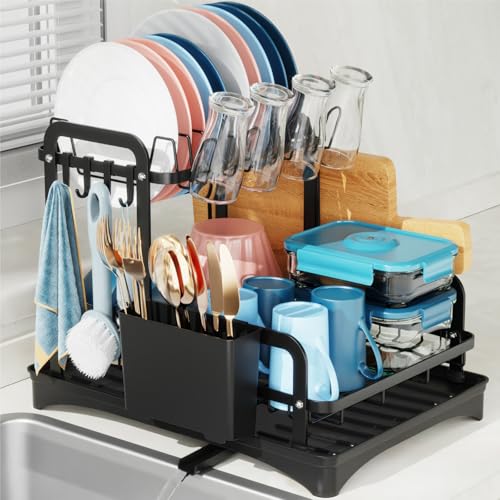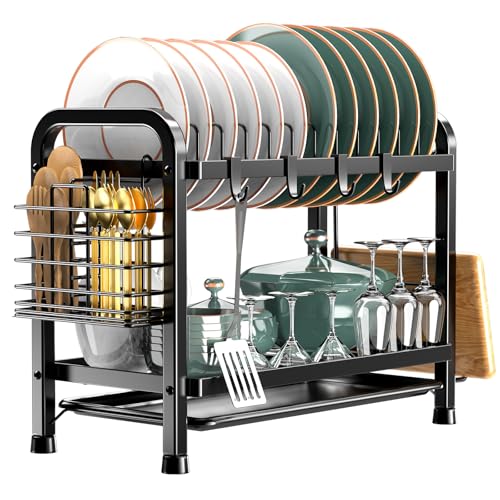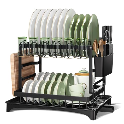 Nfnoyp Dish Drainer Rack, 2 Tier Dish Drainer Rack Multifunctional, Rustproof Dish Racks with Drainboard, Space-Saving Utensil & Cup Holder for Kitchen Counter, Black