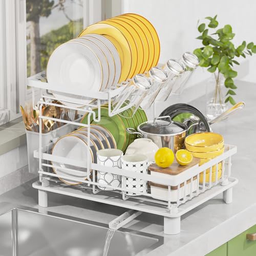 MAJALiS Dish Drying Rack, 2 Tier Dish Drainer Rack with Drip Tray and Drainer Mat, Stainless Steel Dish Rack with Utensil Holder, Swivel Spout, Draining Board for Kitchen Counter, White
