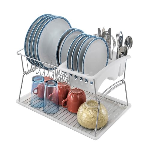 LIONONLY 2 Tier Dish Drainer Rack with Drip Tray, Detachable Dish drying Rack with Swivel Drainage Spout, Utensil & Cup Holder,Dish Rack for Kitchen Counter