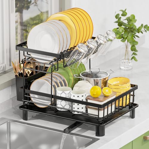 2 Tier Dish Drainer Rack for Kitchen with Drip Tray, Sink Drainer with 360° Swivel Drainage Spout, Dish Drying with Cups, Utensil & Cutting Board Holders for Kitchen Counter Space-Saving, Black