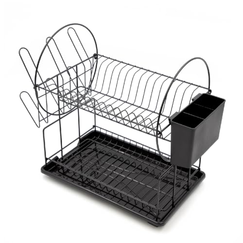 Dish Drainer Black (43.5 x 24.5 x 34.5), 2-Tier Stainless Steel, Dish Drainer with Utensil Holder and Drip Tray