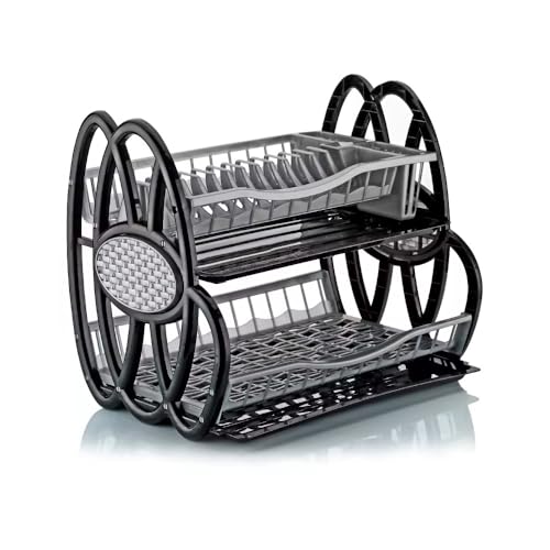 Best House Double Plastic Dish Rack, 2 Tier Double Dish Drainer Rack Large Plate Cutlery Cup Holder Plastic Trays - Pack of 1 (Black)