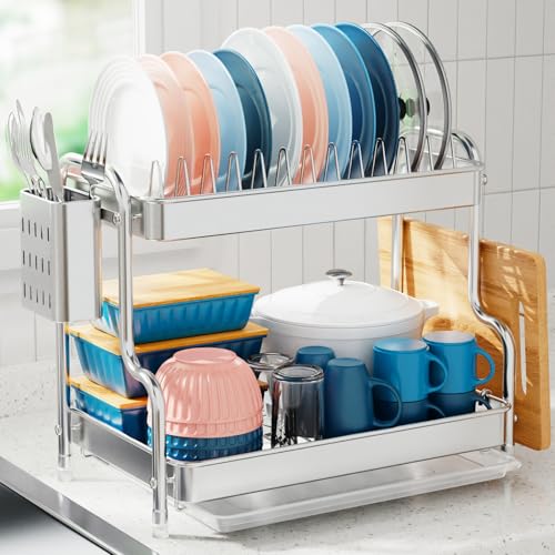 LIONONLY 2 Tier Dish Drainer Rack with Drip Tray, Detachable Large Dish drying Rack with Swivel Drainage Spout, Utensil & Cup Holder,Dish Rack for Kitchen Counter
