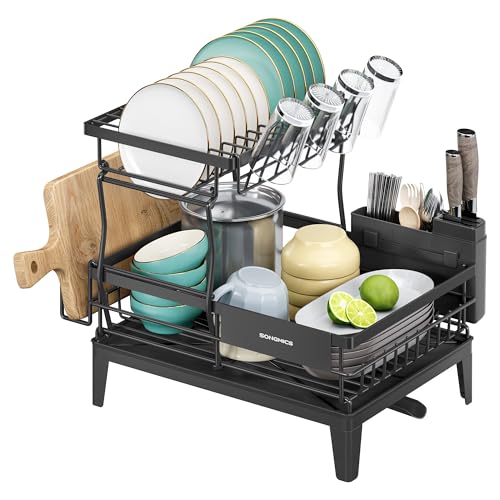 SONGMICS Dish Drying Rack, 2-Tier Stainless Steel Dish Drainer with Extendable Spout, Drainboard, Cup Holder, Fingerprint-Resistant, for Kitchen, 32.5 x 58 x 39.6 cm, Silver and Black KCS032B01