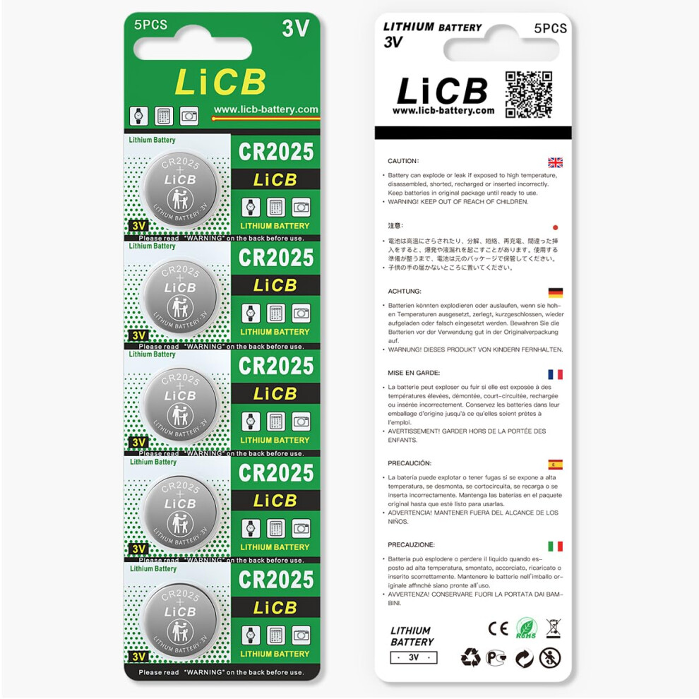 CR2025 Batteries 3V 5-Pack 180mAh High Capacity Long-Lasting Leak Proof High Performance CR 2025 Battery
