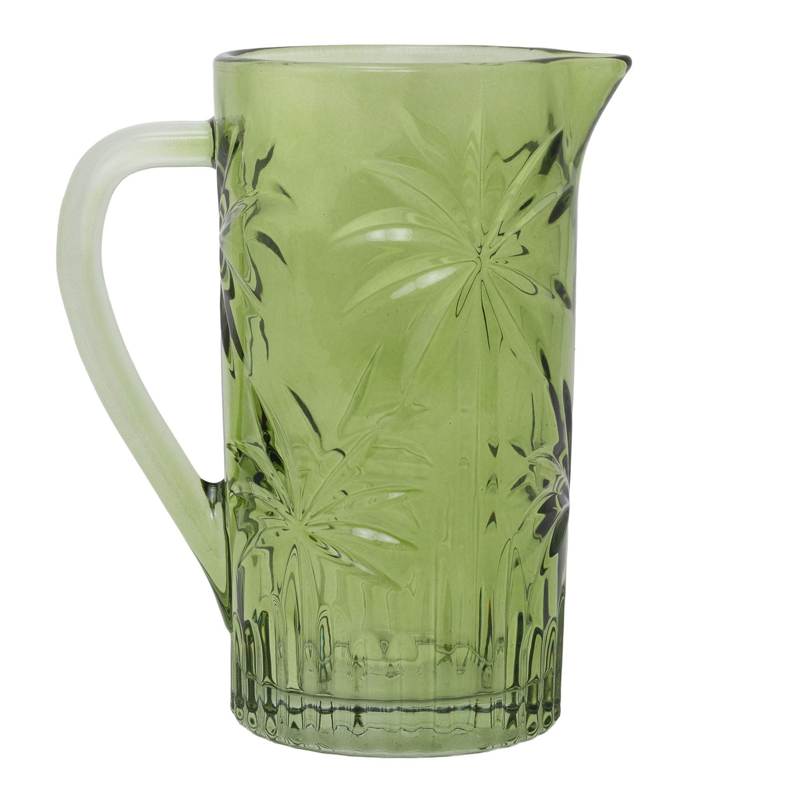 Green Glass Water Jug, 1 Litre Palm Embossed Drinks Pitcher Flower Vase 20cm