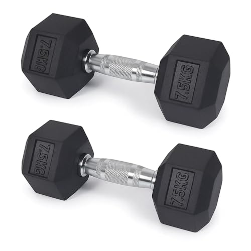 Hex Dumbbells Set – Rubber Encased Anti-Roll Hand Weights with Chrome Handles for Strength Training, Weightlifting & Home Gym – Single or Pair – 2.5kg to 20kg (Pair 7.5kg / 16.5lbs)