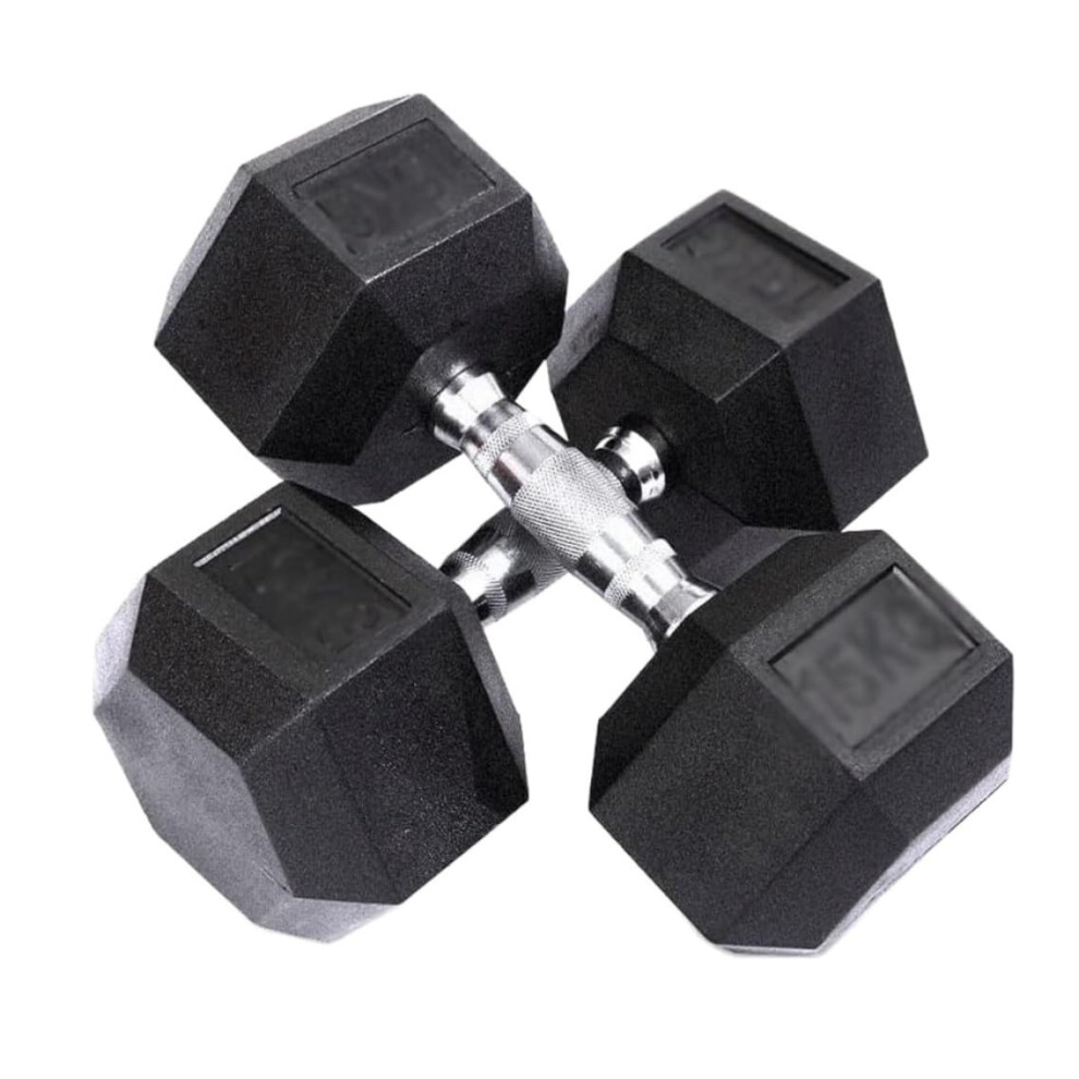 Rubber Dumbbells, 5kg - 20kg Pairs, Black with Chrome Handles, Modern Fitness (15, Kilograms)