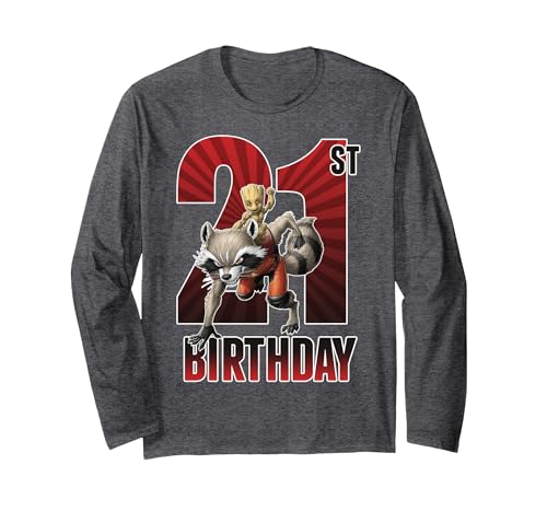 Marvel Guardians of The Galaxy Rocket & Groot 21st Birthday Long Sleeve T-Shirt, Adult Unisex, Dark Heather Grey, Medium