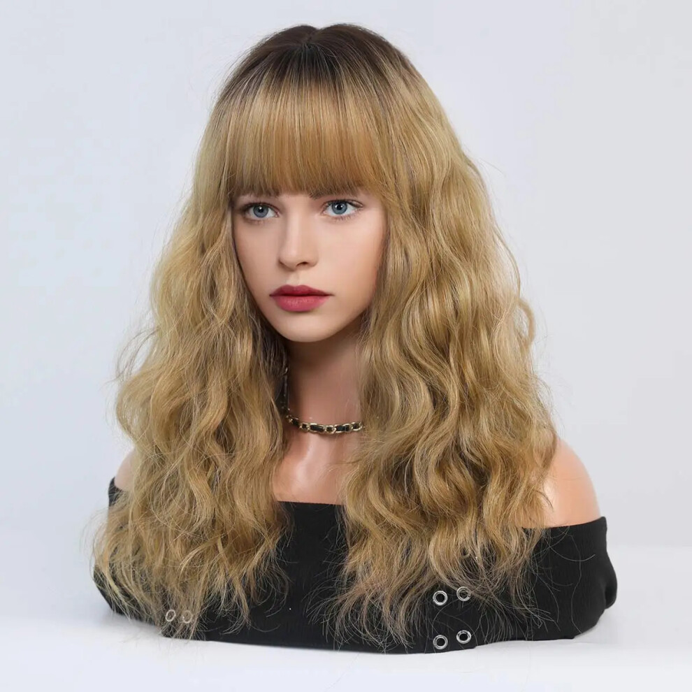 (Dark gold_54cm 21.25inch) New wig women haze blue wavy curly medium curly hair high temperature silk wig cover Blue Wigs