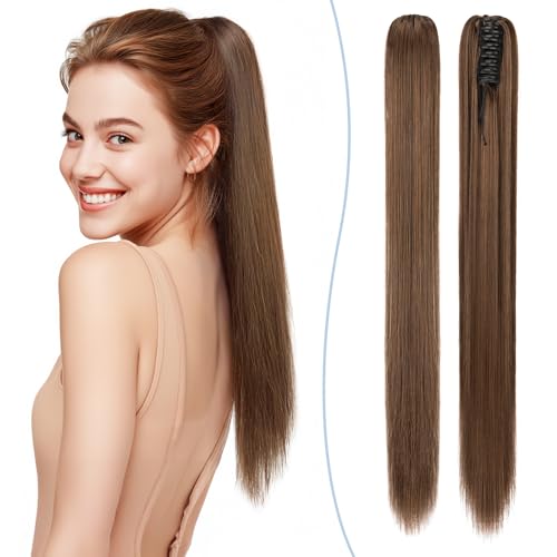 SEGO 21 Inch Claw On Ponytail Extension Matte Material Straight Clip In Pony tail Synthetic Hairpiece, Medium Brown & Dark Brown