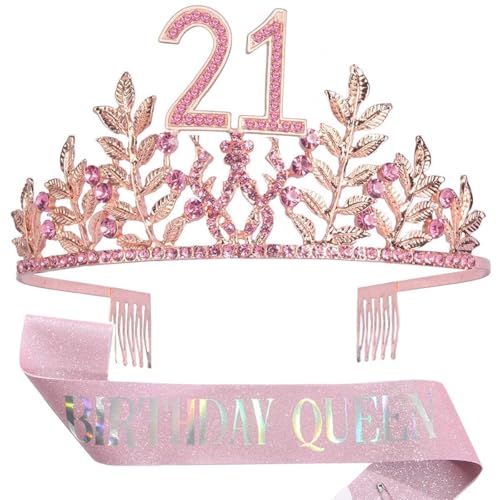 21st Birthday Crystal Tiara and Sash, 21th Rose Gold Birthday Rhinestone Crowns and Sash for Women, 21th Birthday Decorations for Her, Birthdays Accessories Gifts