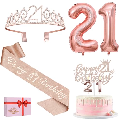 Amosking 21st Birthday Decorations for her, Including 21st Birthday Sash and Tiara, Cake Topper and Candles, Rose Gold Number Balloons, 21 Year Old Gifts for Her