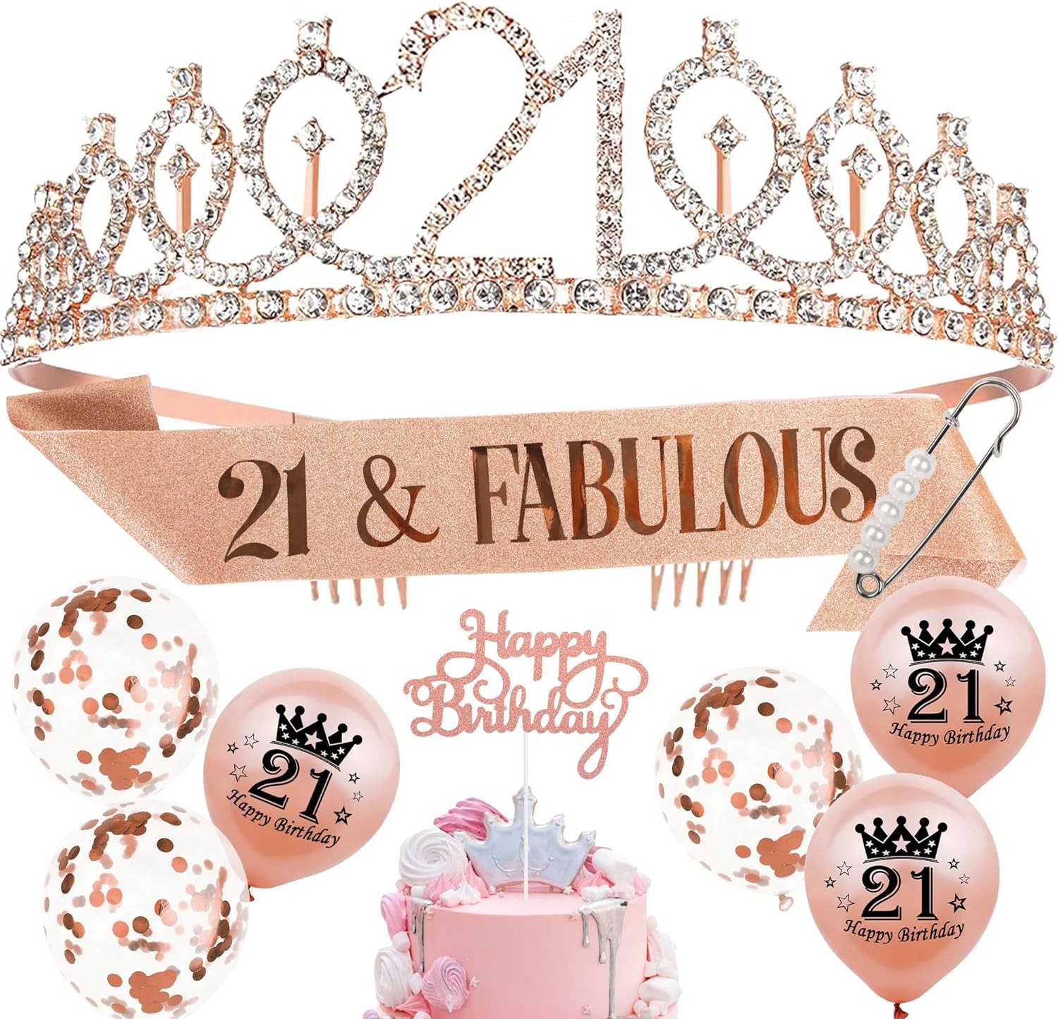 Rose Gold 21st Birthday Decorations for Girls - Sash, Tiara, Cake Topper, Foil Balloons & Party Favors