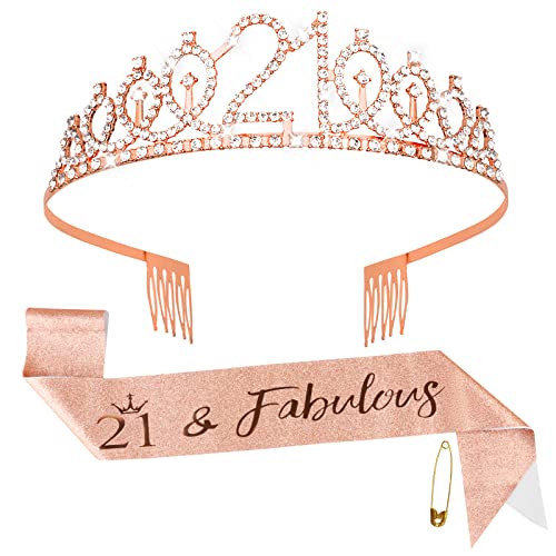 MIOSJI 21st Birthday Sash and Crystal Tiara Crown, 21st Birthday Gifts for Her Girls Birthday Decorations Party Accessories (Rose Gold)