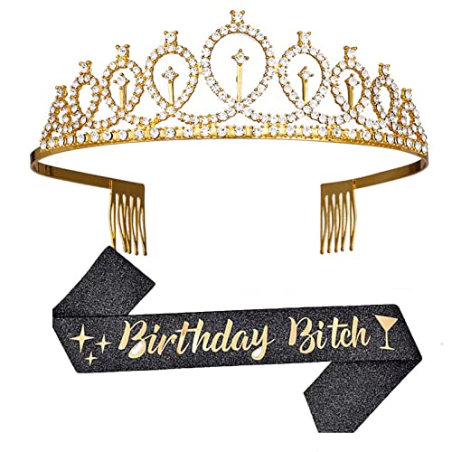 Leixi Birthday Bitch Sash & Rhinestone Tiara Kit - 21st & 30th/40th Birthday Gifts - Women's Party Supplies (Black)