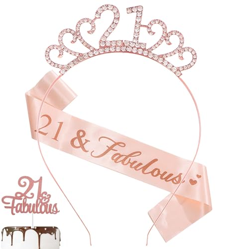 TOPWAYS 21st Birthday Sash and Tiara Set, Rose Gold 21 Glitter Crown Headband & Fabulous Sash Party Supplies 21st Birthday Gifts for Women Girls Her 21st Birthday Decorations (21 Fabulous, Rose Gold)