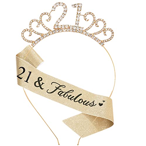 MIOSJI 21st Birthday Sash and Crystal Tiara Crown for Decorations, Gifts for Her Party Accessories Gold