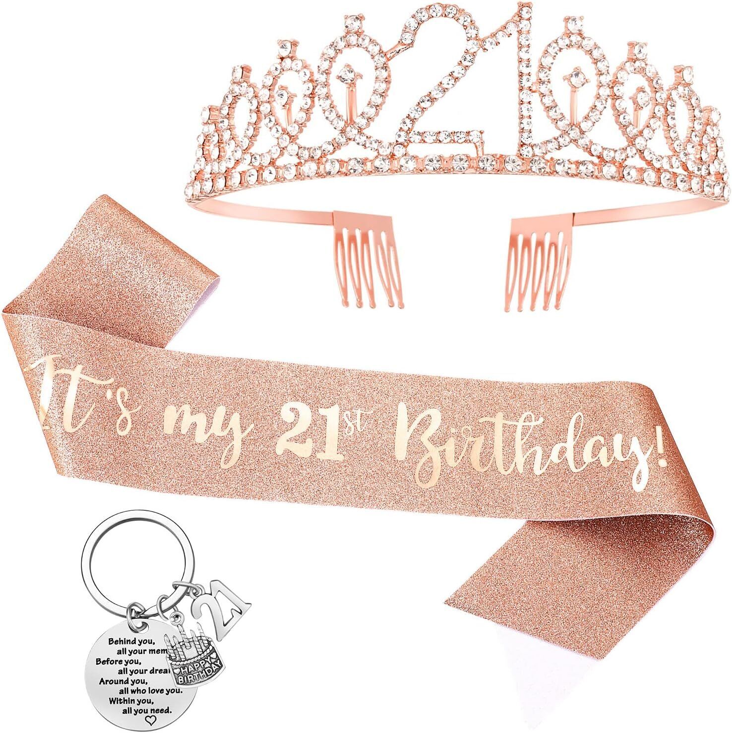 3Pcs 21St Birthday Sash and Crown Tiara Keychain for Girls Rose Gold 21St Birthd