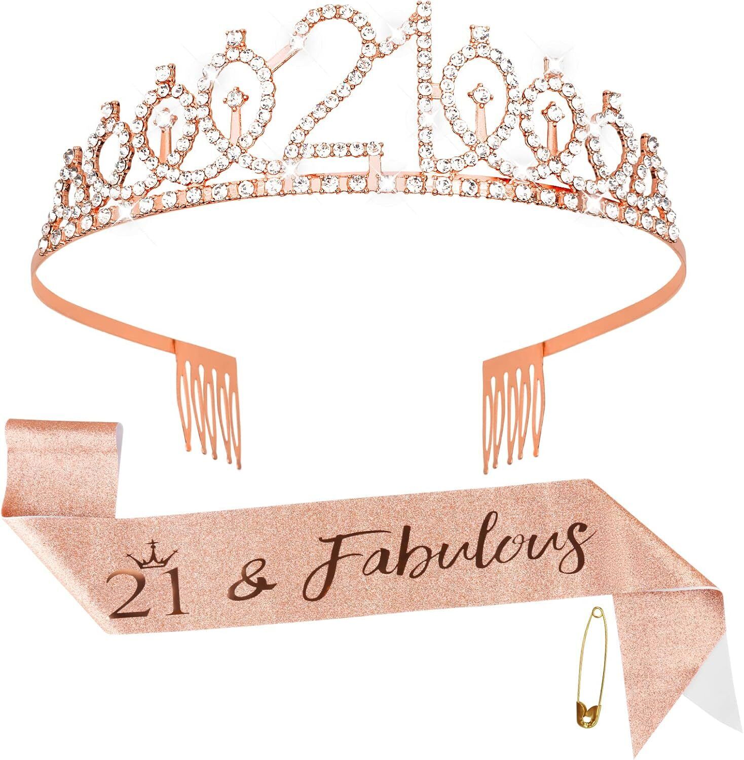 Fowecelt 21st Birthday Sash Tiara - Rose Gold Birthday Queen Tiara and Sash for
