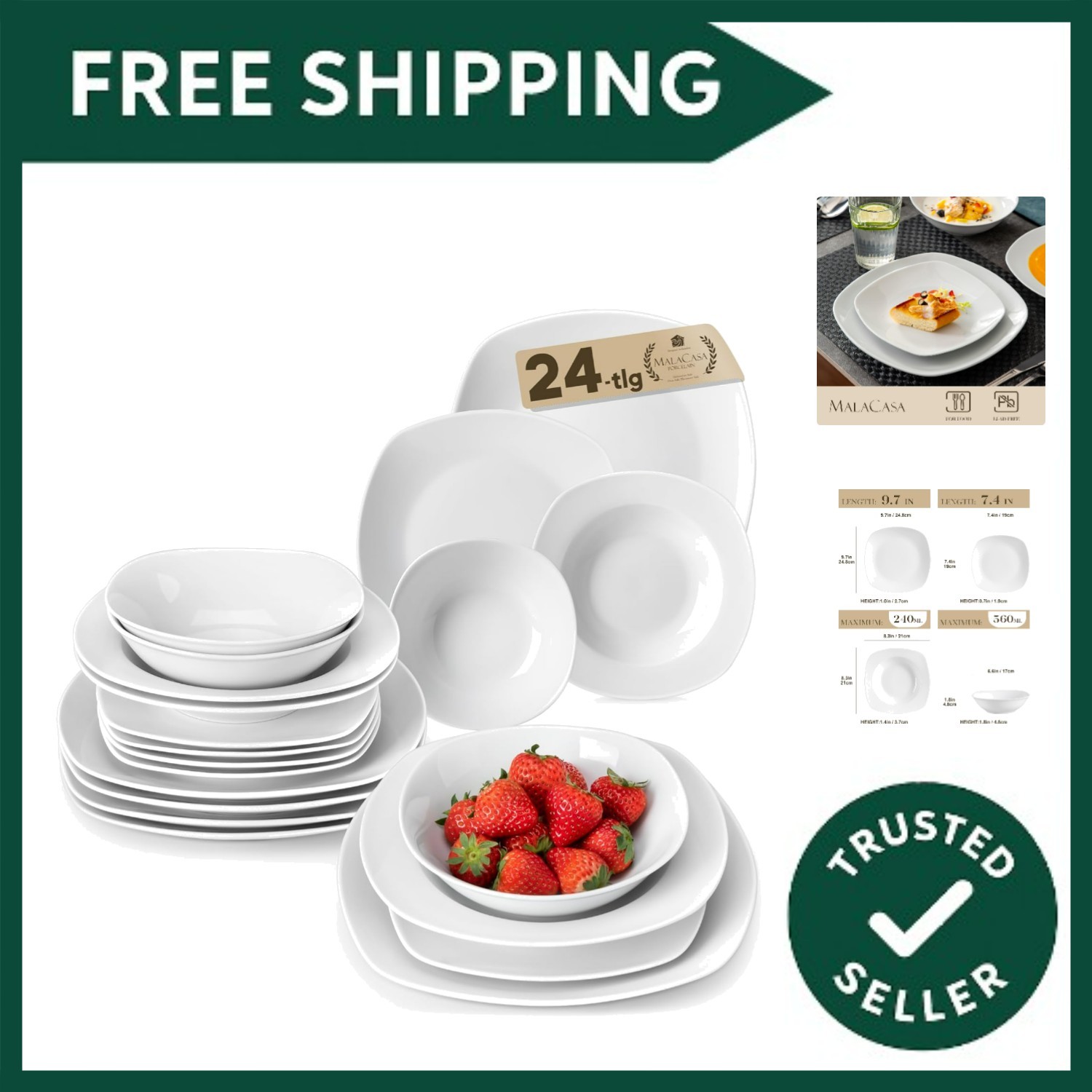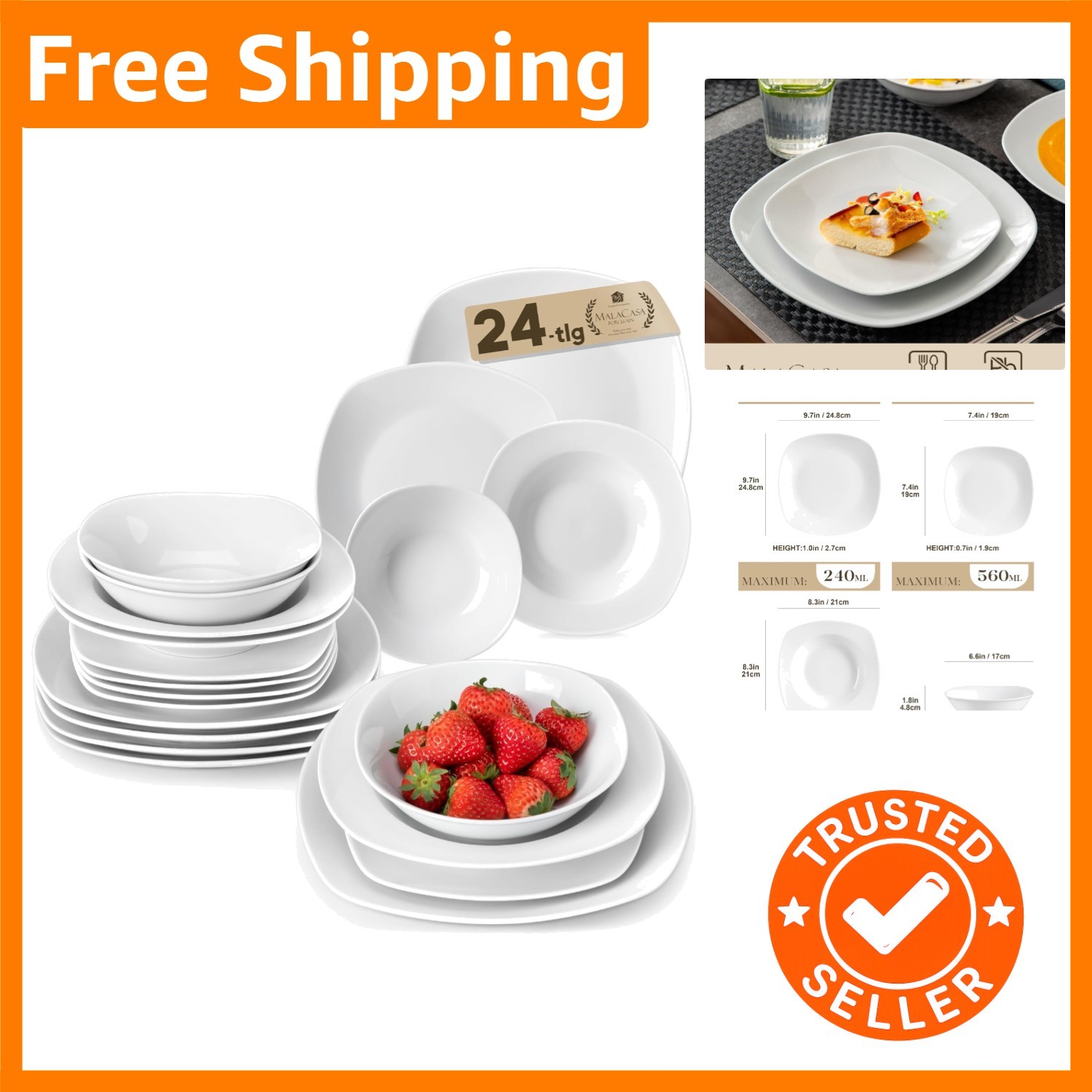 MALACASA, Series Elisa, 24-Piece Dinner Sets Ivory White Porcelain Dinnerware Set with 6-Piece Cereal Bowls/Dinner Plates/Dessert Plates/Deep Soup Plates, Service for 6