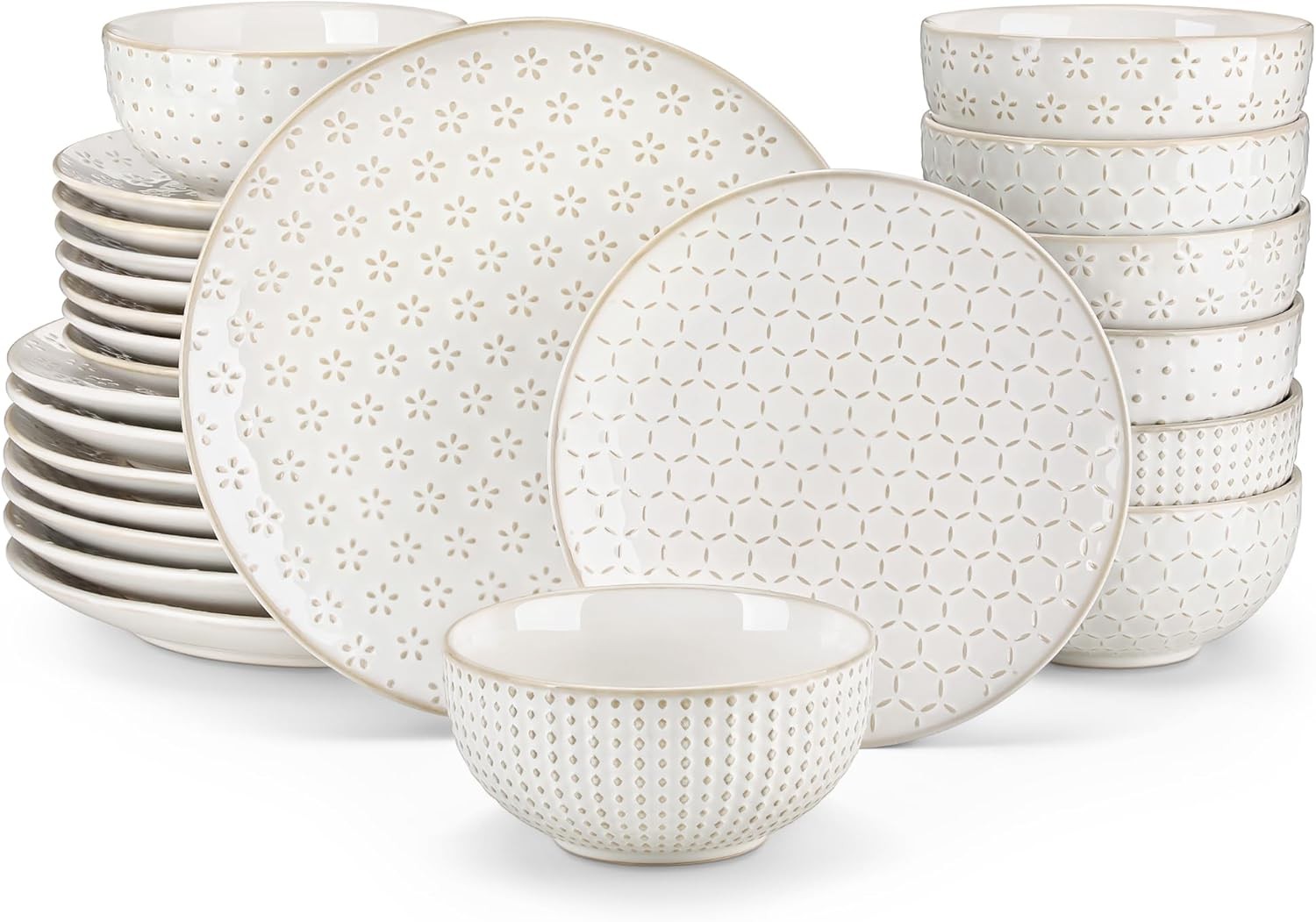 MALACASA 24 Piece Dinnerware Set, Embossed Ceramic Plates & Bowls for 8