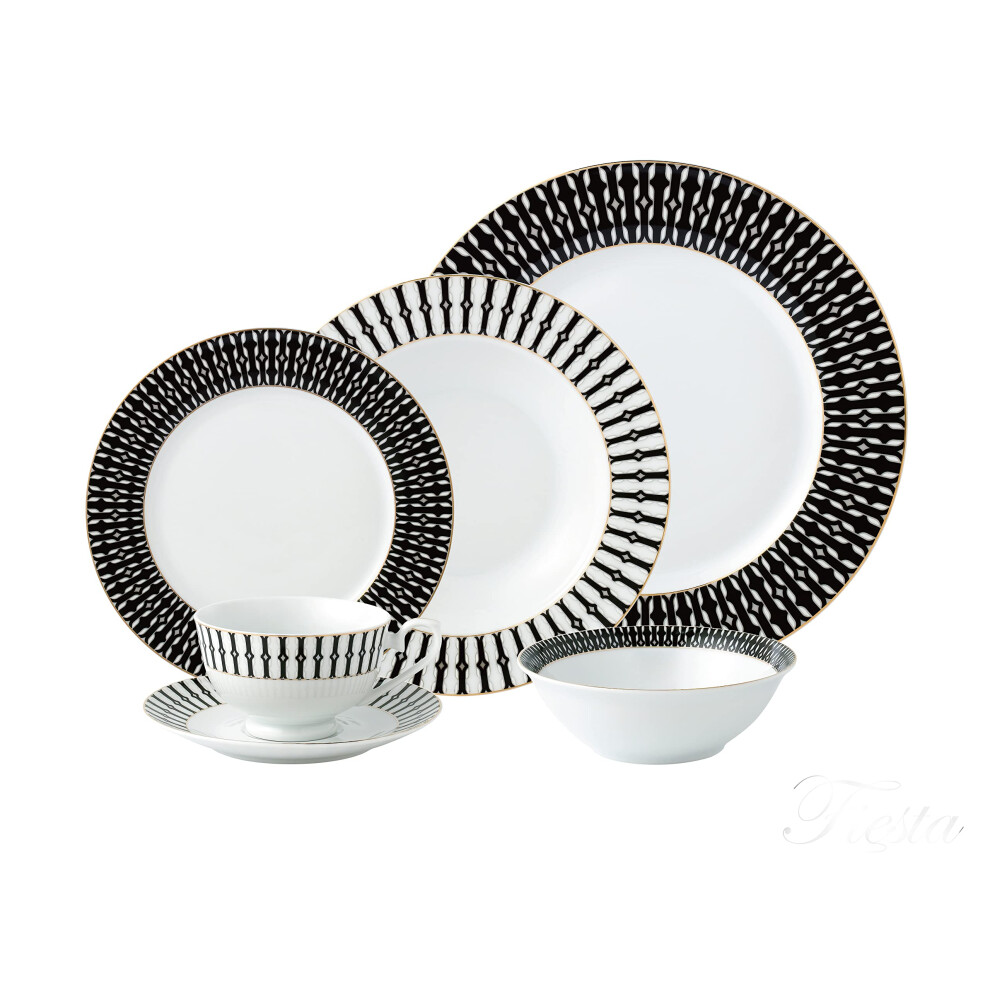 Karaca Gem 24-Piece Dinner Set for 6 People, Black & White Bone China Dinnerware Sets, Scratch & Crack Resistant, Dishwasher Safe, Luxury Plate Set with Marble & Gold Geometric Design
