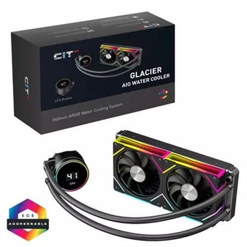 CiT Pro Glacier AIO 240mm Liquid CPU Cooler with ARGB LED Lighting Dual PWM Fans and Real-Time Temperature Display - Black