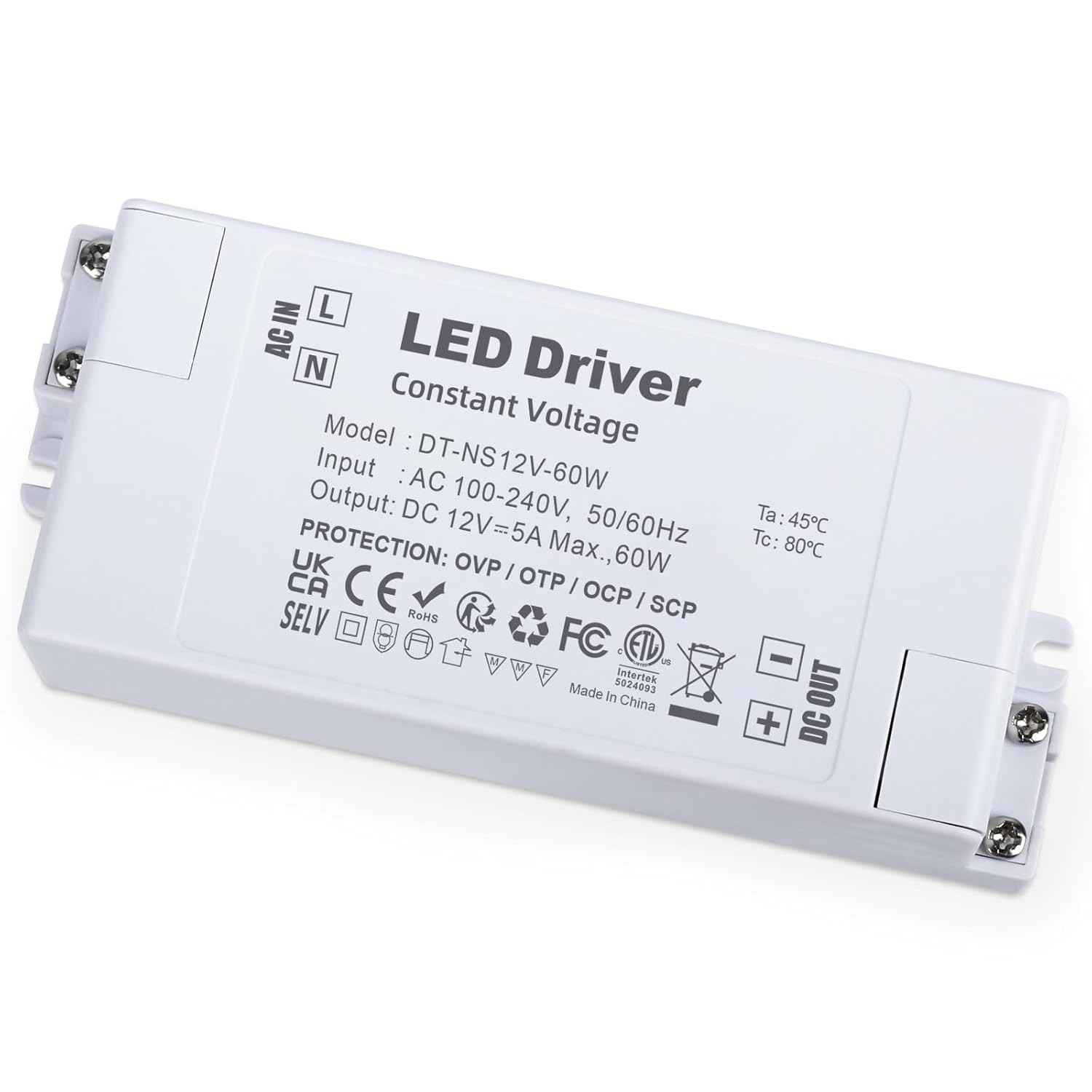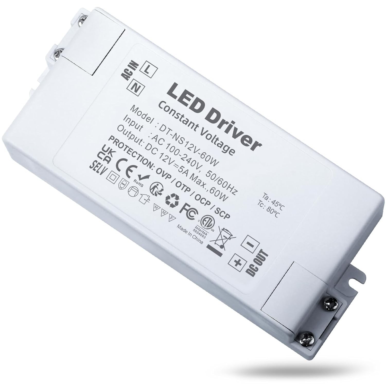 LED Transformer 60w, 12V Power Supply Driver Adapter 240V AC to 12V DC 5A - Constant Voltage for LED Strip Lights, Cabinet, Display and G4, MR11, MR16 Bulbs Driver