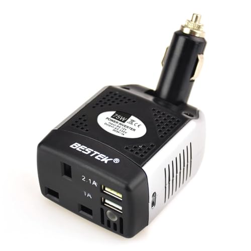 BESTEK 75W Car Charger Power Inverter DC 12V to AC 230V 240V Voltage Converter Transformer with UK Outlet Socket and Dual USB Ports Auto Adapter Plug for Phone Tablet Laptop