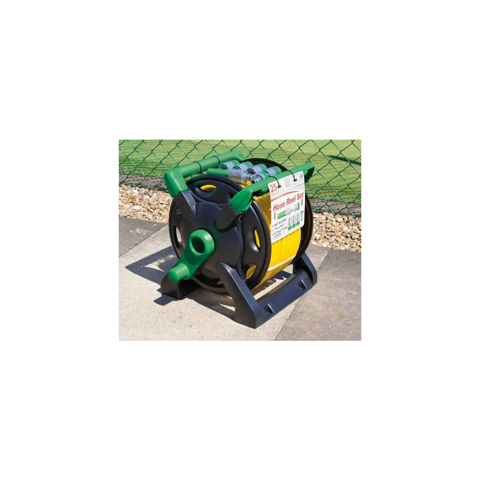 UK Made Garden Thru Feed Hose Reel Set with 25 Metre Hose and 6 Connectors. Free Standing and Can be Wall Mounted. (X7082) Free UK Postage