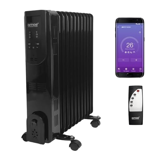 AMOS 11-Fin 2500W Oil Filled Radiator Wi-Fi Smart App Enabled & Remote Control 3 Heat Settings Timer Digital Display, Black