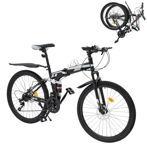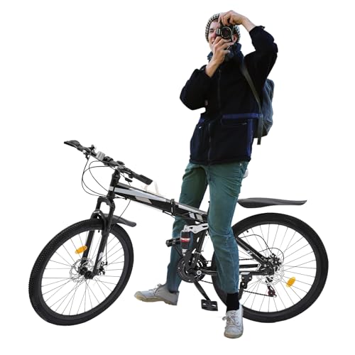 MEHOOSPVN 26 Inch Folding Mountain Bike 21 Speed MTB Bicycle Bike Trail Bike with Dual Disc Brakes High-carbon Steel Frame Mens and Womens Mountain Bicycle, Adjustable Seat Height, Mudguard Set, Black