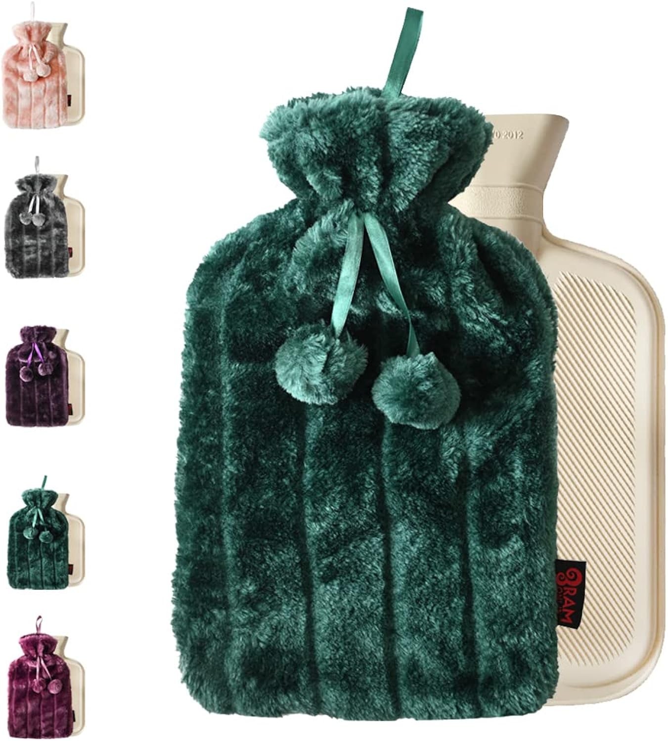 Ram 2 Litre Green Hot Water Bottle with Faux Fur Cover and Pom Poms