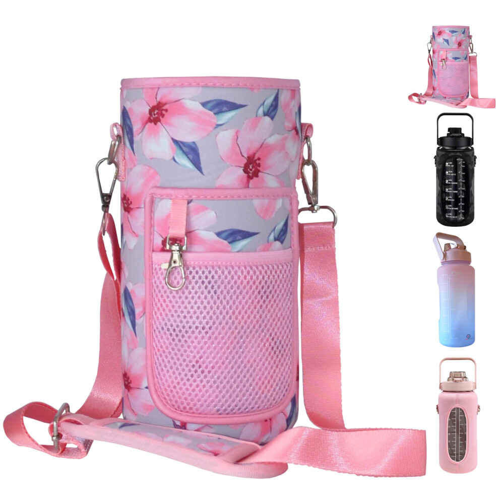 TradeProvider 2litre Drinking Water Bottle Carrier Sleeve Bag with Adjustable Strap, Pockets and Key Holder Bottle Sleeve - Pink with Floral Design