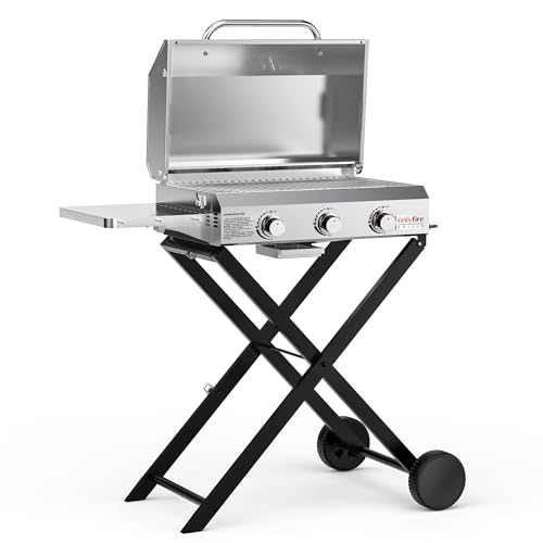 Onlyfire 3-Burner Portable Gas BBQ, Outdoor Gas Barbecue Grill 7KW Power with 22" Cooking Grate, Thermometer, Side Table Shelf & Foldable Trolley, Stainless Steel